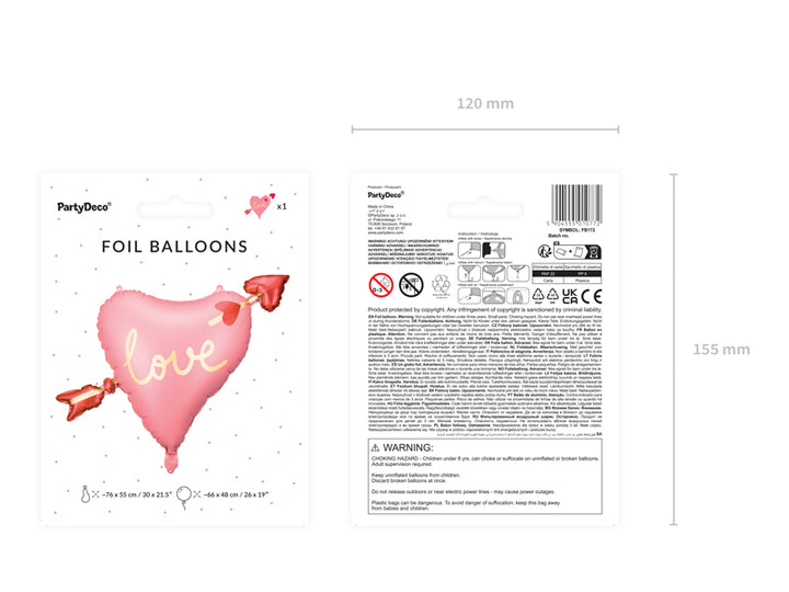 Foil balloon Heart with arrow, mix of colours, size before inflation approx. 76 x 55 cm (30 x 21.5''), size after inflation approx. 66 x 48 cm (26 x 19''). Inflate with air and helium. Set contains a straw.