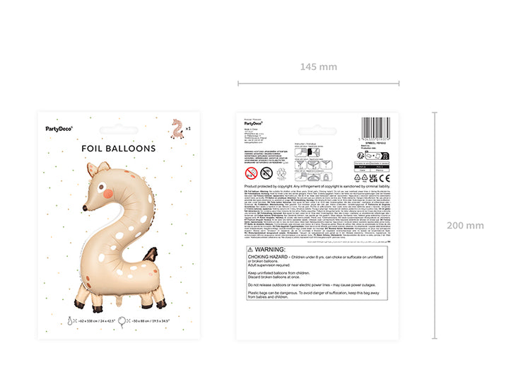Foil balloon Number 2 - Roe-deer, mix of colours, size before inflation approx. 65 x 102 cm (25.5 x 40'')), size after inflation approx. 50 x 88 cm (19.5 x 34.5''). Inflate with air and helium. Set contains a straw.